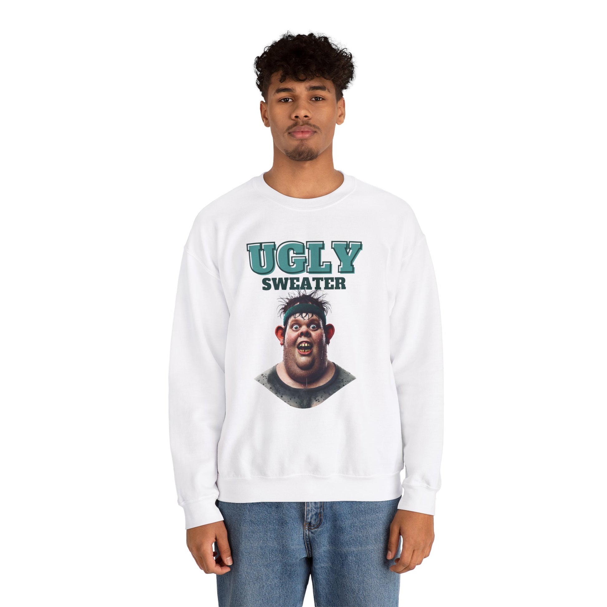 This holiday season, take ugly sweater contests to the next level with the ultimate "Ugly Sweater" - literally! Featuring an outrageously goofy design of a sweaty guy with bulging eyes, big ears, and a few missing teeth, this sweater is hilariously hideous. With his signature headband and drenched look, it’s the perfect recipe for holiday laughs. Wear this to your next party, and you might win the ugliest sweater contest!